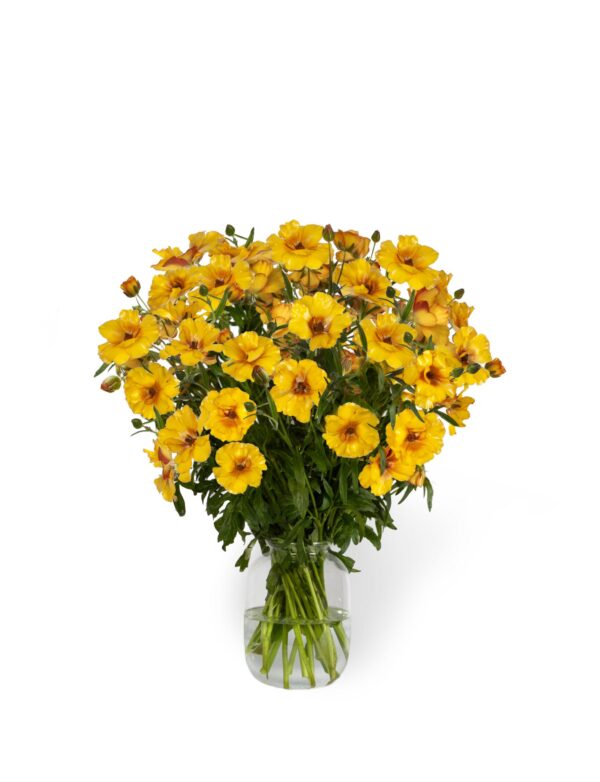 Een gele soort die goed is voor een lang vaasleven. Elke steel heeft maar liefst vijf tot zeven bloemen dragen. Deze Ranunculus heeft een ongewone kleur, groeit goed op het zuidelijk halfrond en is perfect voor de snij.