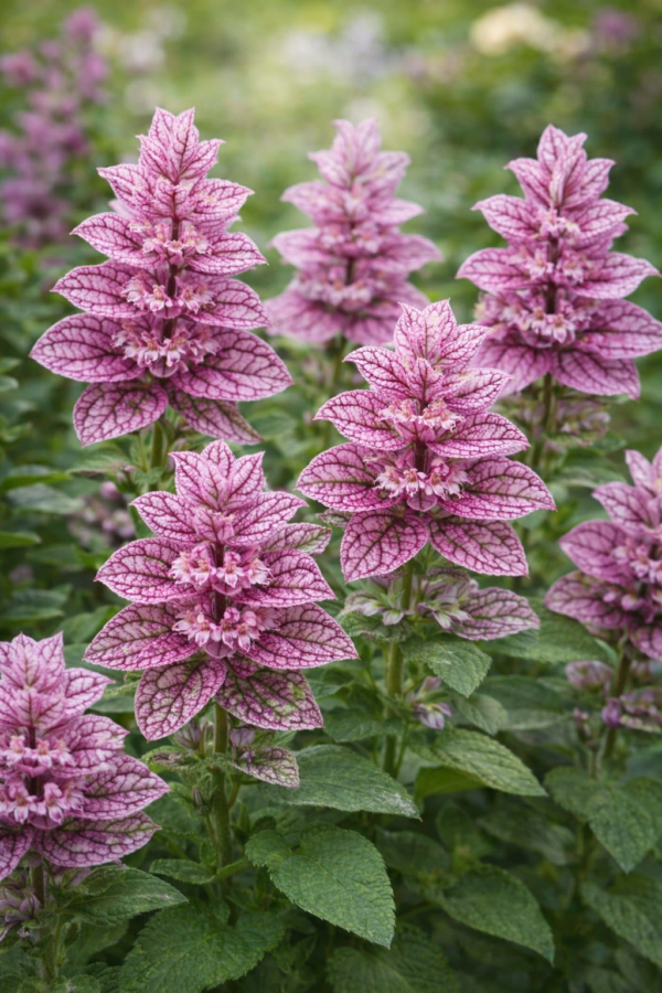 Salvia horminum ‘Pink Sundae’ groeit rechtop en bossig en bereikt doorgaans een hoogte van ongeveer 40 tot 60 centimeter. De plant vormt stevige stelen met frisgroene, licht behaarde bladeren. Wat deze salvia echt bijzonder maakt, zijn de roze tot oudroze schutbladeren die als een soort vlaggetjes boven de bloei uitsteken. De eigenlijke bloemen zijn kleiner en vaak wit tot lichtroze, maar worden prachtig omlijst door de gekleurde bracteeën.