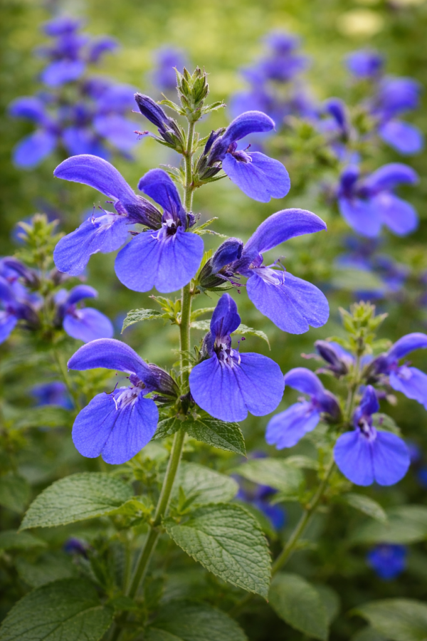 Wat Salvia patens direct onderscheidt van andere salvia’s, is de diepe, bijna fluweelachtige blauwtint van de bloemen. De trompetvormige bloemen verschijnen meestal in de zomer en bloeien door tot in de vroege herfst. Ze staan in losse aren boven frisgroen, eirond blad. De plant bereikt gemiddeld een hoogte van 50 tot 80 centimeter, waardoor hij perfect is voor de midden- of achterzijde van een border.