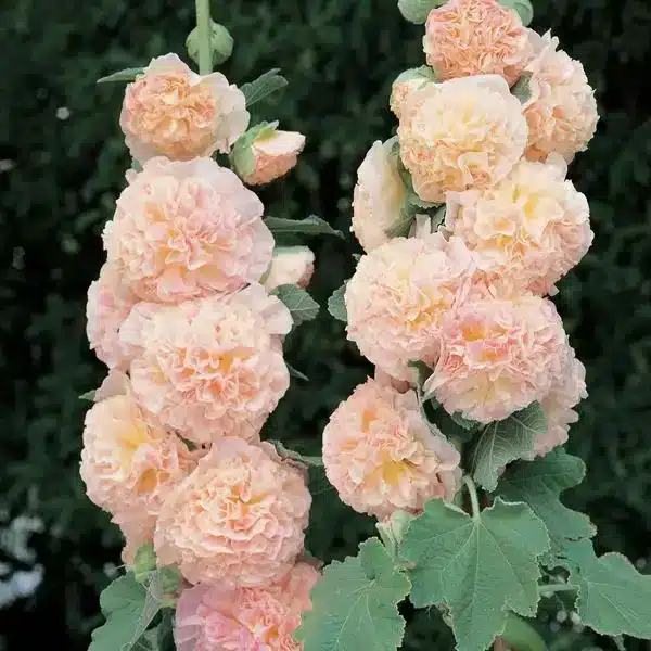 Alcea rosea 'Chater's Salmon Pink' är en rikblommande stockros med stora, tätt packade, dubbla blommor. Långblommande.