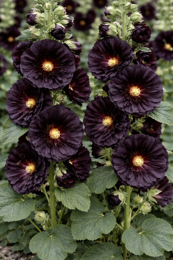 Blommorna på 'Nigra' är stora, enkla eller halvdubbla, och växer i täta klasar längs de kraftiga stjälkarna. Den nästan svarta färgen kontrasterar vackert med ljusare blommor som vita, rosa eller gula, vilket skapar en dramatisk accent i trädgården. Tack vare sina slående blommor är denna stockros också perfekt för romantiska, stugiga eller moderna rabatter.