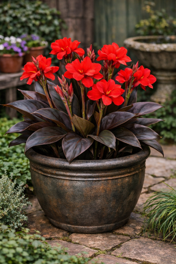 Det som Canna indica Tropical Darkleaved Red från mängden är den intensiva kontrasten mellan de klarröda blommorna och det mörka, bronsfärgade bladverket. Detta skapar en dramatisk, lyxig effekt som omedelbart drar till sig ögat. Kombinationen av färg och bladstruktur gör denna växt särskilt lämplig som ett iögonfallande element i moderna och tropiska trädgårdar.