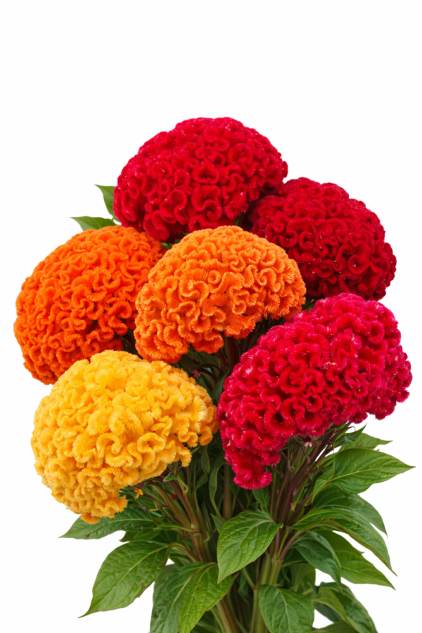 Celosia argentea cristata Chief Mixture kännetecknas av sina stora, rundade blomhuvuden med en kompakt, klotformad struktur. Till skillnad från den klassiska veckade tuppkamformen erbjuder denna serie robusta, jämna blommor med ett kraftfullt utseende.