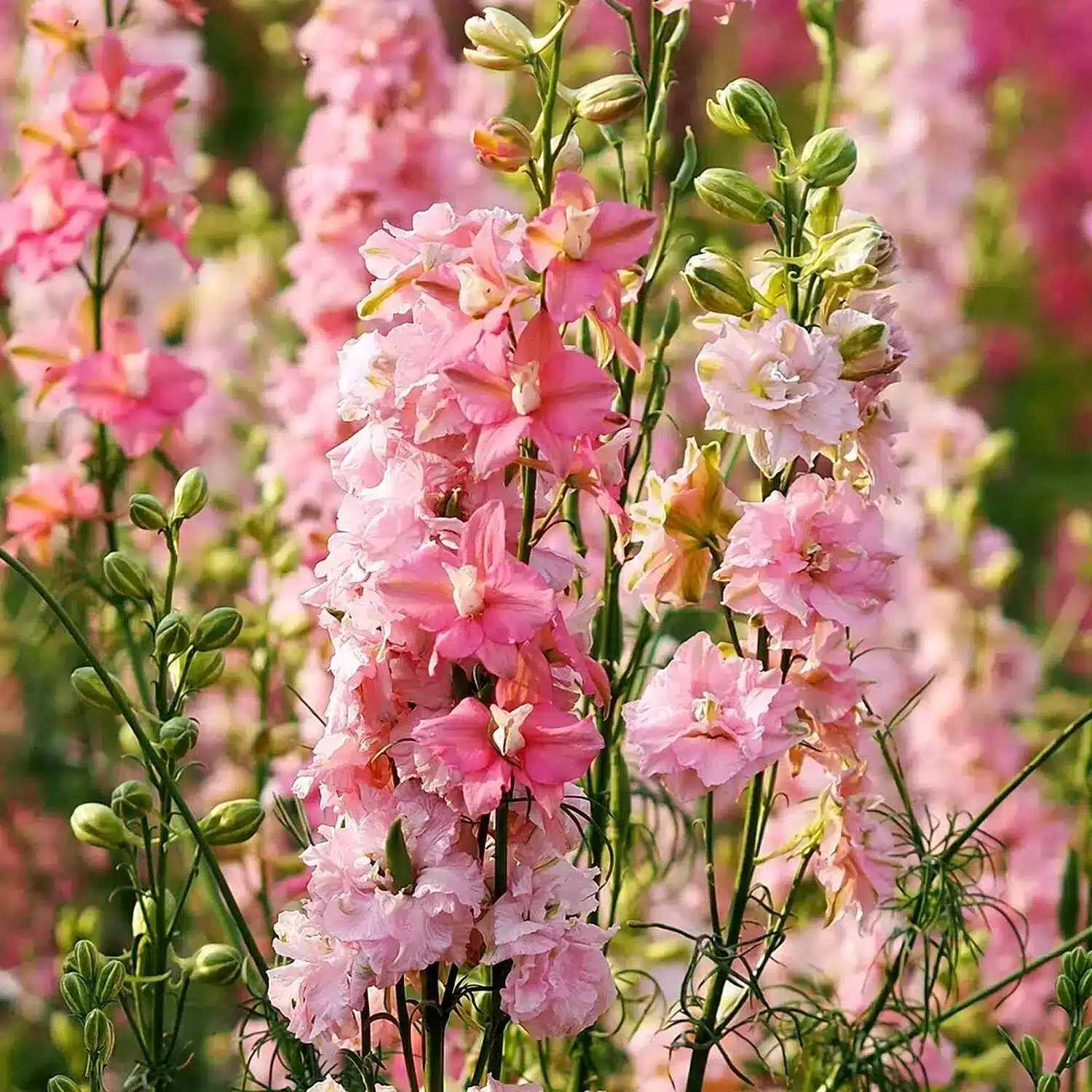 Höga axlar av ovanliga laxrosa, pappersartade blommor.