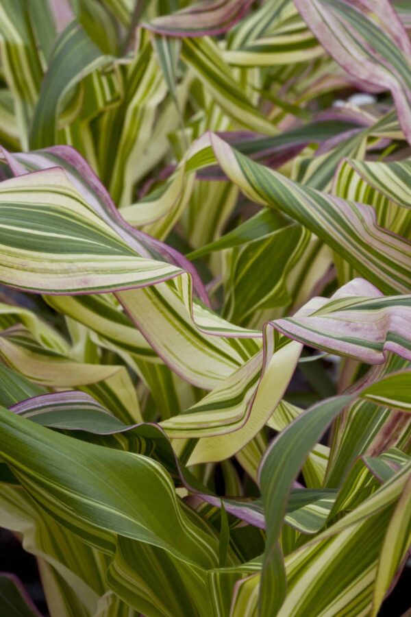 Brokiga blad, vilket betyder att de har en blandning av färger, ofta med slående mönster. Dessa blad har vanligtvis en kombination av gröna och vita eller krämfärgade ränder.