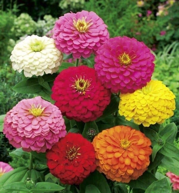 Zonminnende zomerbloemen met grote dubbele bloemen in vrolijke kleuren.